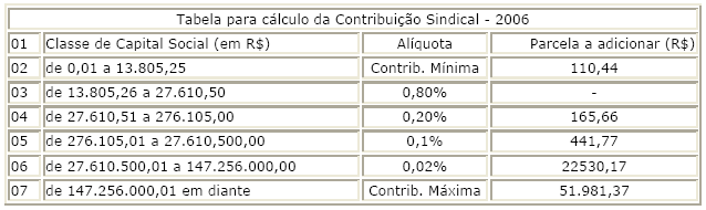 Tabela da Contribuição Sindical O pagamento da contribuição sindical é obrigatório a partir do registro da empresa e a cada ano, no mês de janeiro. A sua quitação é um documento essencial e indispensável para os seguintes casos: - Concorrências públicas ou administrativas e para fornecimento às repartições estatais ou autarquias; - Obtenção de registros ou licenças para funcionamento, junto as repartições federais, estaduais e municipais; e Exibição perante a Fiscalização da DRT. - Cabe à Caixa Econômica Federal manter uma conta especial em nome de cada uma das entidades beneficiadas (art. 588) e promover a distribuição das contribuições arrecadadas na proporção indicada pelo art. 589 da CLT e na forma das instruções que forem expedidas pelo Ministério do Trabalho e Emprego, a saber: I - 5% para a Confederação correspondente;(CNI) II - 15% para a Federação;(FIESP) III - 60% para o Sindicato respectivo; IV - 20% para a "Conta Especial Emprego e Salários". Antes de emitir sua Guia, consulte o valor na tabela abaixo: