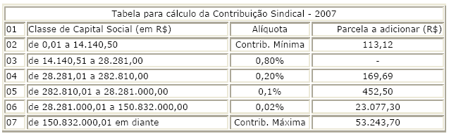 O valor da contribuição é proporcional ao capital social da empresa, registrado na Junta Comercial do Estado. O recolhimento deve ser feito até 31 de janeiro de cada ano, em guia própria. O não pagamento na data mencionada, acarreta multa de 10% (dez por cento) nos 30 primeiros dias, adicionado de 2% (dois por cento) por mês subseqüente de atraso, além de juros de mora de 1% (um por cento) ao mês, conforme estabelece o Art. 600 da CLT.