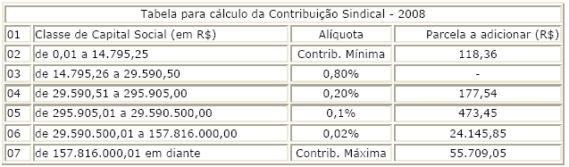 O valor da contribuição é proporcional ao capital social da empresa, registrado na Junta Comercial do Estado. O recolhimento deve ser feito até 31 de janeiro de cada ano, em guia própria. O não pagamento na data mencionada, acarreta multa de 10% (dez por cento) nos 30 primeiros dias, adicionado de 2% (dois por cento) por mês subseqüente de atraso, além de juros de mora de 1% (um por cento) ao mês, conforme estabelece o Art. 600 da CLT.